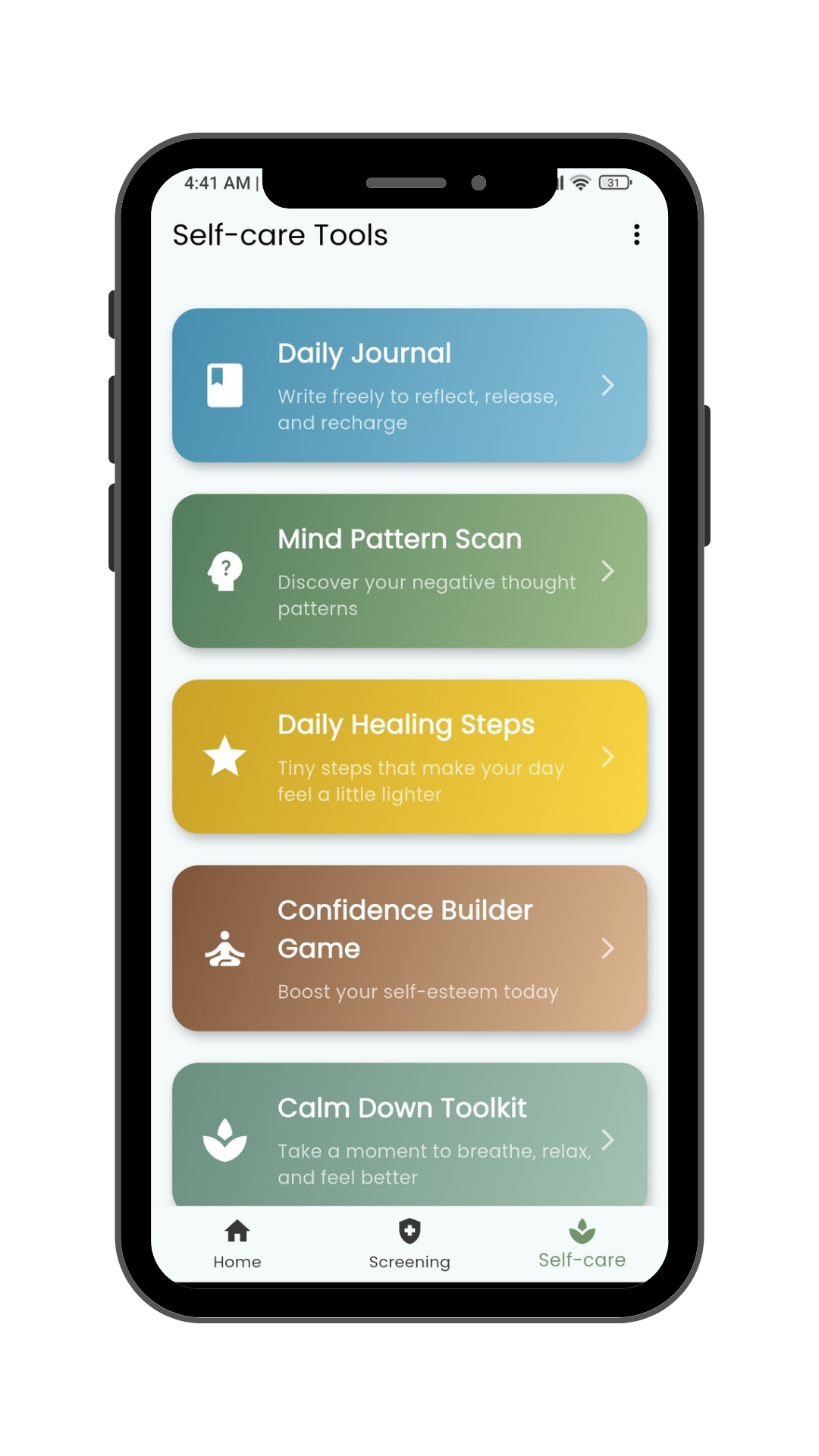 Breathing, journaling, and grounding tools built into the conversation.