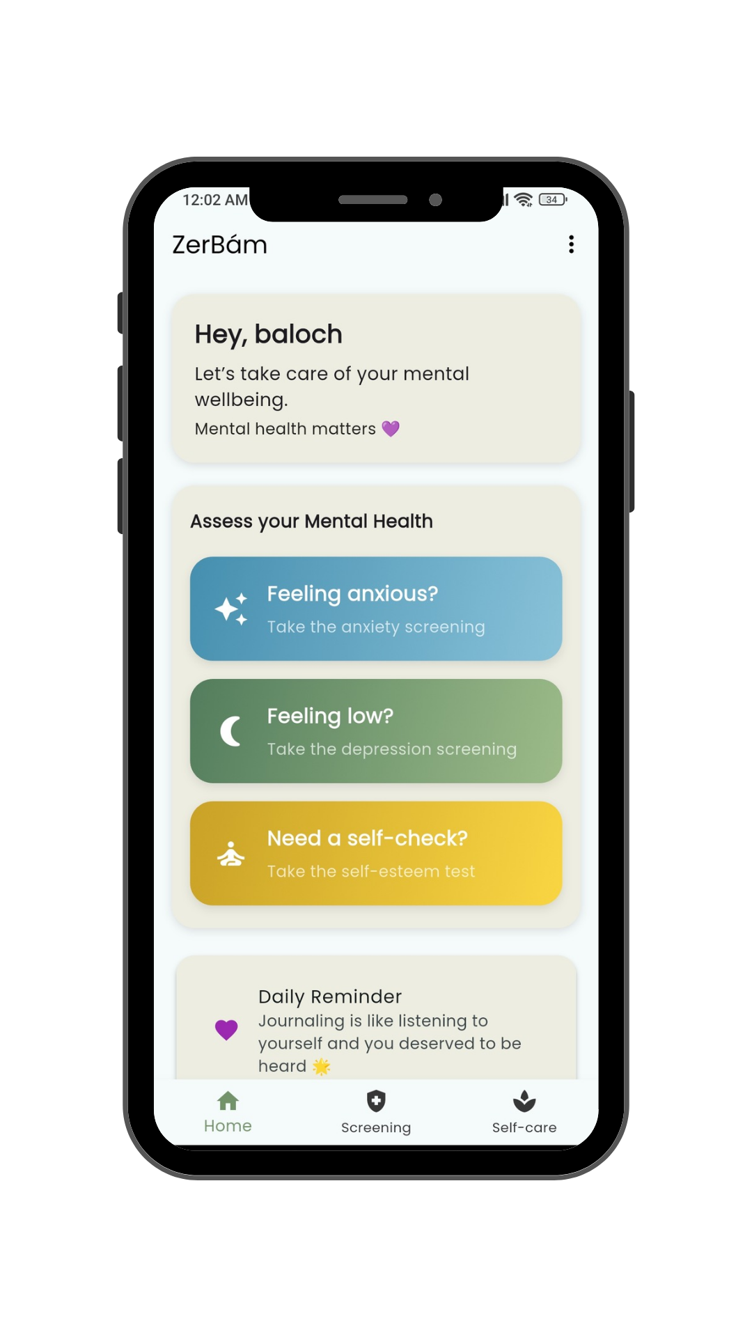 ZerBám is free to download. Track your mood, access self-care tools, and get early support, all anonymously, right from your phone.